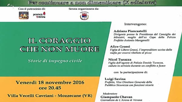 A seguire, alle ore 20.45, presso Villa Vecelli Cavriani, all’interno della rassegna “Per continuare a non dimenticare”, sarà presentato il convegno “Il coraggio che non muore – Storie di impegno civile”; un’occasione per ricordare coloro che hanno vissuto con lealtà ed integrità, credendo nella giustizia e nel rispetto della legge, affrontando ogni giorno con senso del dovere, fino a pagare talvolta con la vita stessa.