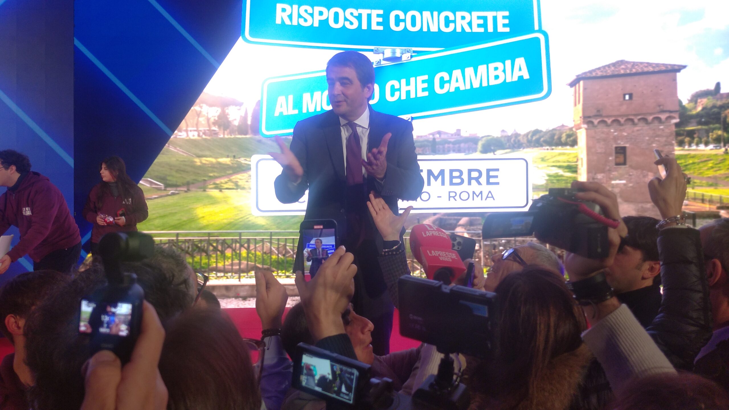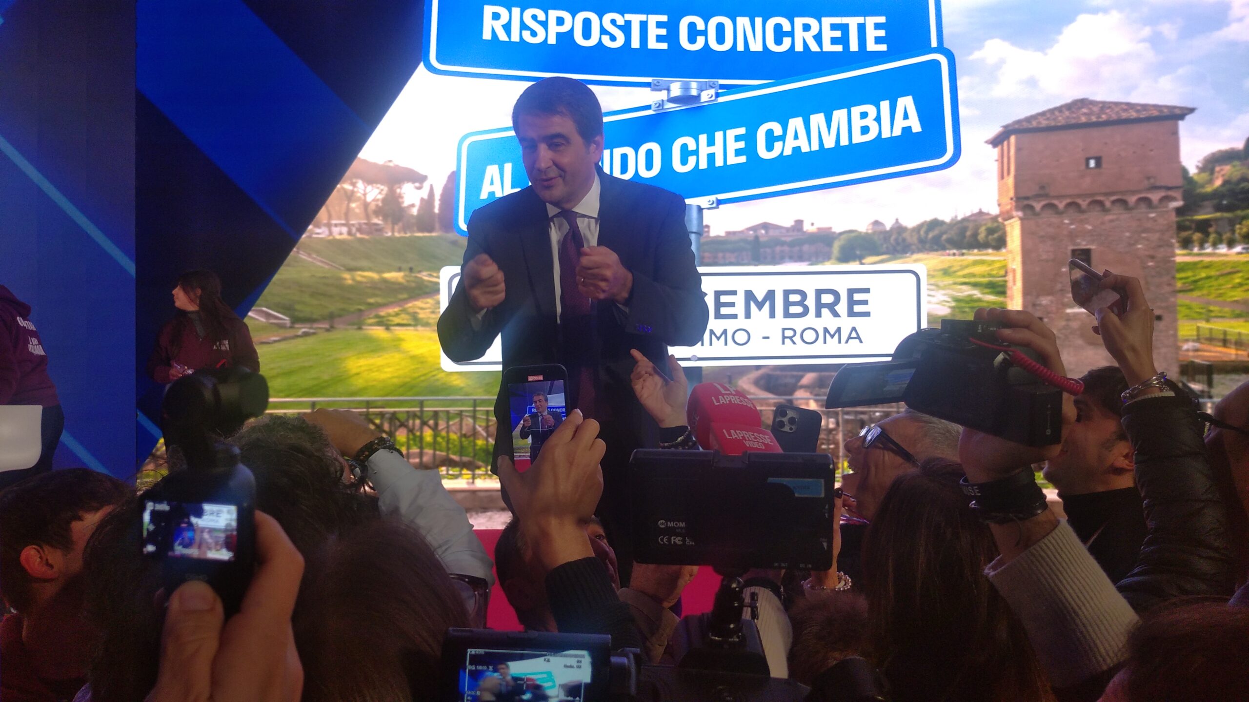 Dita nell’occhio (più che puntate) ad opposizioni di stampo insurrezionale che si nascondono dietro il paravento della Costituzione, violandola smaccatamente con strategia antidemocratica perfida e lesiva della maggioranza degli elettori. L’inizio del suo intervento è stato brevemente interrotto per consentire il soccorso d’una persona che, nella calca, s’è sentita male per poi riprendersi.