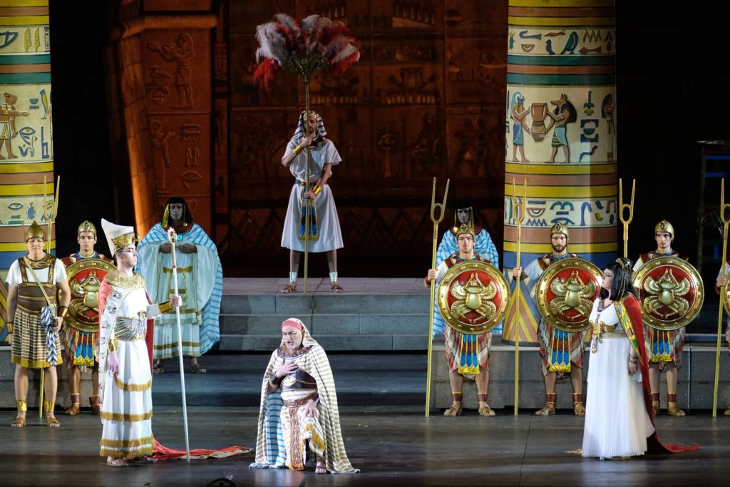 Il cast comprende artisti internazionali legati all’Arena di Verona e all’opera di Verdi: il grande soprano madrileno Saioa Hernández veste i panni della protagonista eponima, il mezzosoprano Judit Kutasi quelli della rivale Amneris, il tenore Carlo Ventre è Radamès, il baritono Badral Chuluunbaatar torna comeAmonasro, i bassi Gianluca Breda e Krzysztof Bączyk si confermanocome gran sacerdote Ramfis e Re degli Egizi, il soprano Yao Bo Hui come Sacerdotessa e il tenore Carlo Bosi come Messaggero.