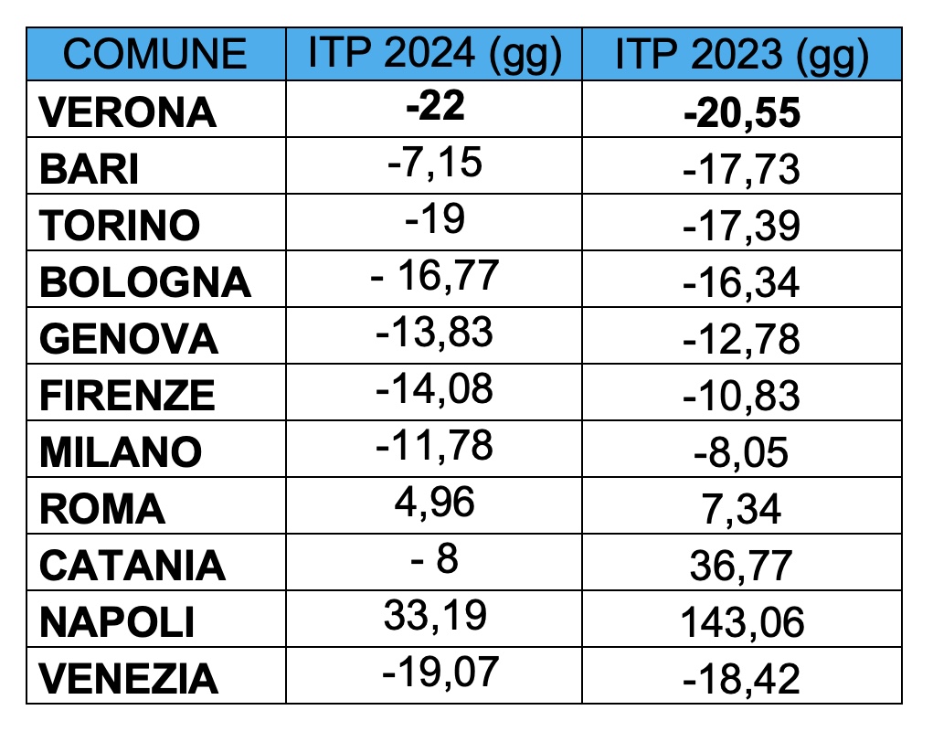 L’indice di tempestività dei pagamenti invece è stato pari a -22, che rappresenta lo scostamento tra la data di pagamento e la data di scadenza della fattura. Il che vuol dire che il Comune di Verona ha pagato le imprese circa 22 giorni prima del termine previsto per il saldo delle fatture. Nel 2023, il dato si attestava su -20,55, quindi l’indicatore è migliorato ulteriormente quest’anno. Si tratta del miglior risultato ottenuto dai Comuni appartenenti alla fascia di popolazione superiore ai 250 mila abitanti come si evince dalla seguente tabella, che riporta le informazioni pubblicate nella sezione “Amministrazione Trasparente” dai singoli Enti: