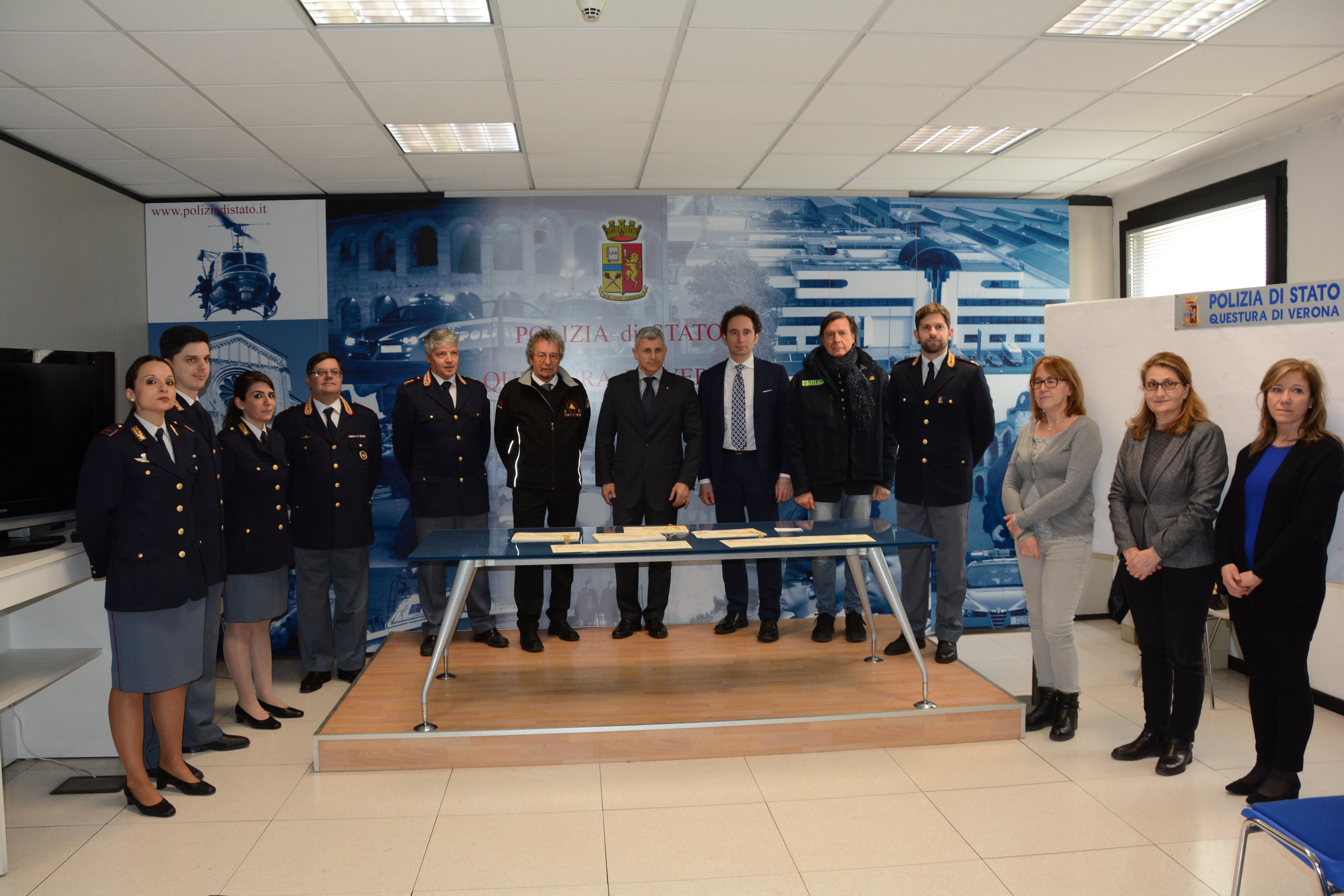 Nella giornata di oggi, presso la Sala Stampa della Questura di Verona, si è svolta la cerimonia di consegna degli attestati, cui hanno preso parte il Signor Vice Questore Vicario Dr. Alfonso Polverino, il Portavoce della Questura Dr. Bruno De Santis, il Medico Capo Dr. Franco Ariosto e il Medico Capo Dr. Giuseppe Lippolis.
