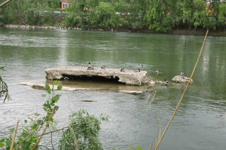 La constatazione, cioè, della presenza a pelo d’acqua ed a non molta distanza dalla riva (nei pressi del ponte della Ferrovia, a lato di via Stefano de Stefani), d’un curioso e massiccio ammasso squadrato di cemento (con un “satellite” a parte ed un ampio basamento sottostante) che, con portate maggiori, scompare alla vista. Ora, col periodo di secca, riemerge tutta l’insolita struttura della “piattaforma” diventata l’“isola che c’è” per anatre in riposo.