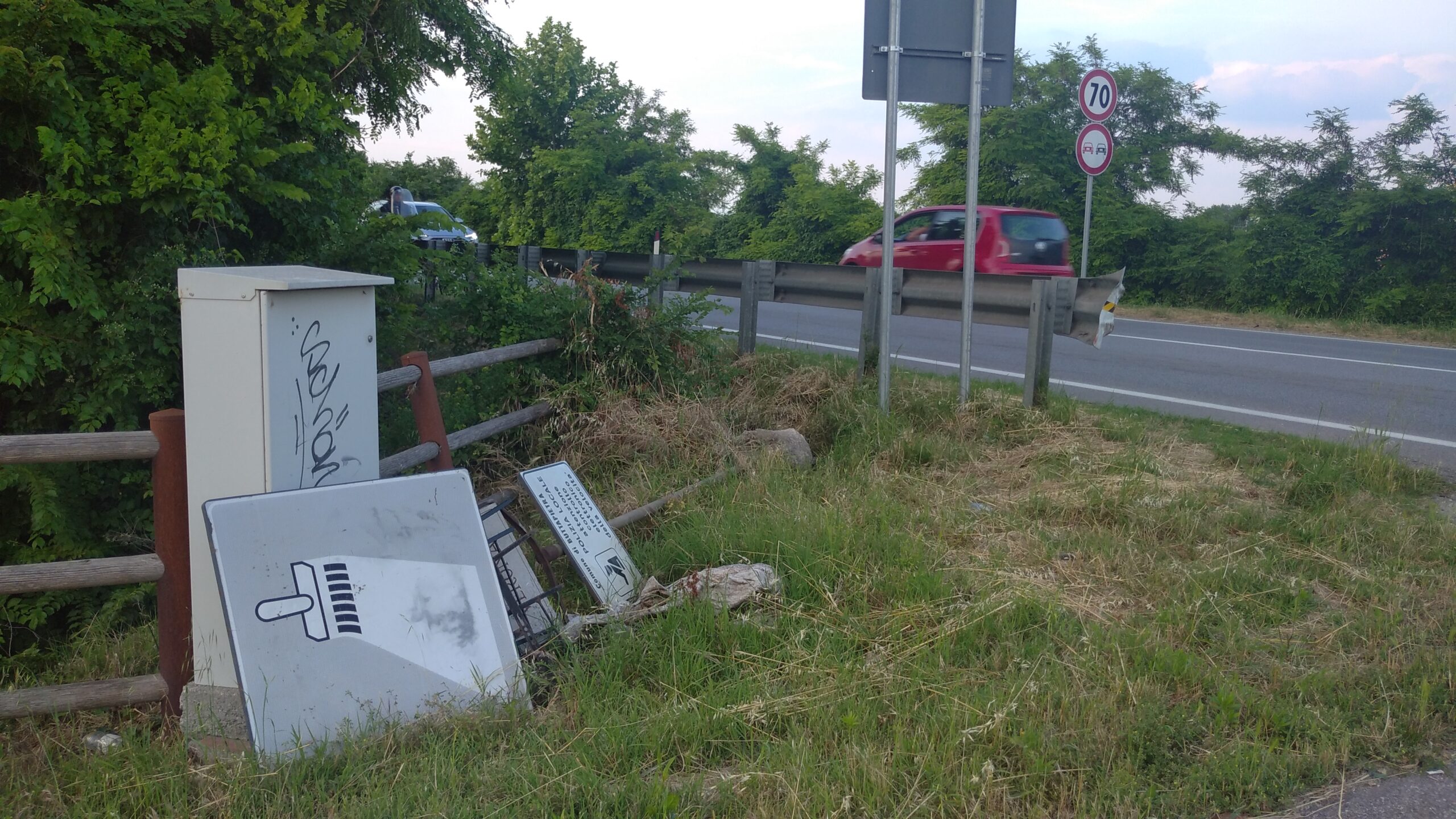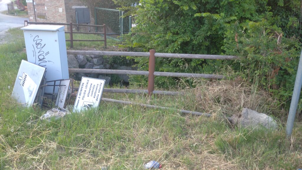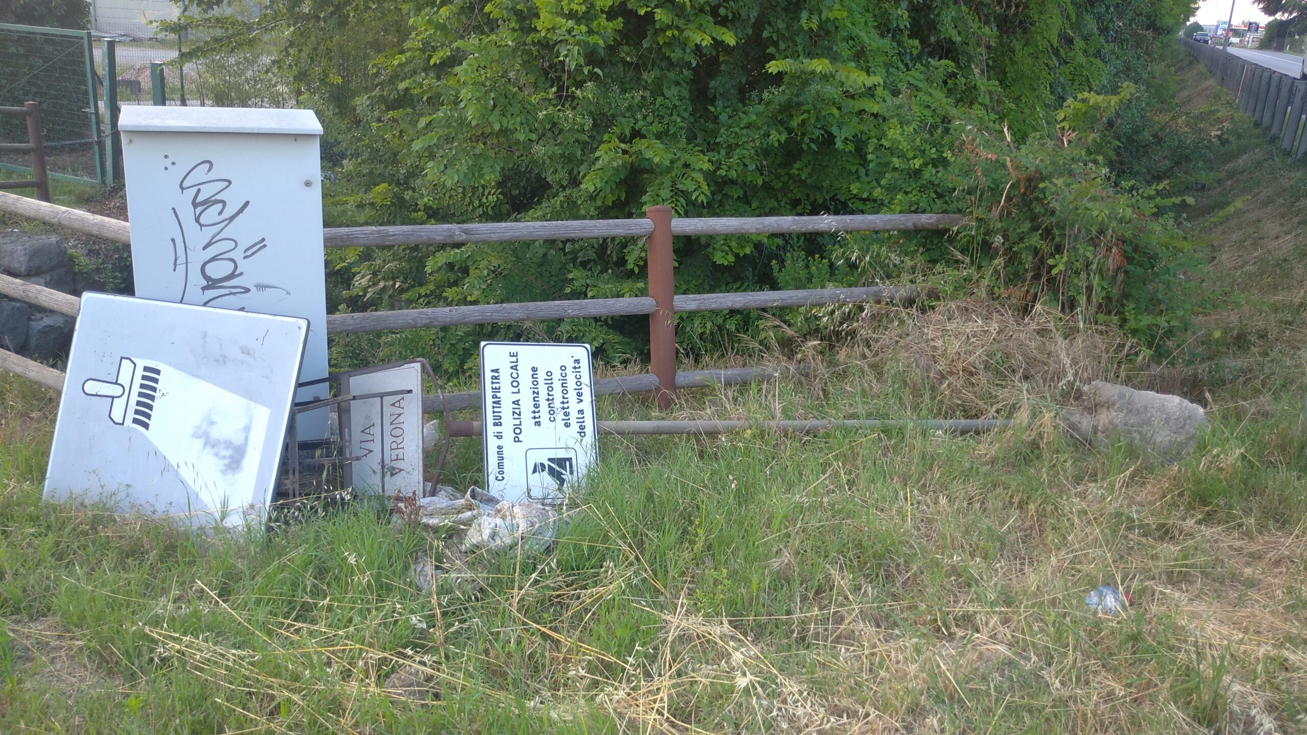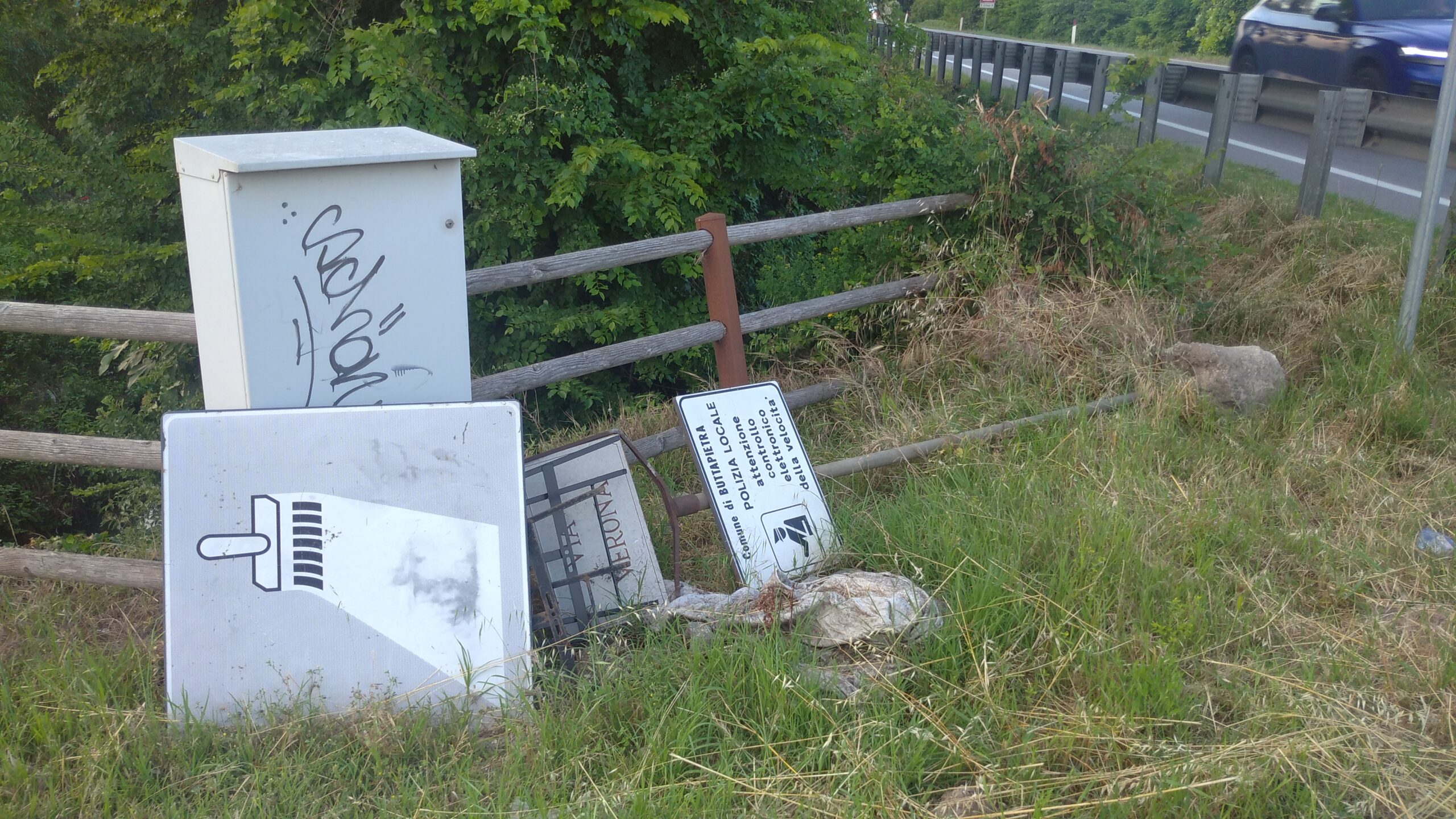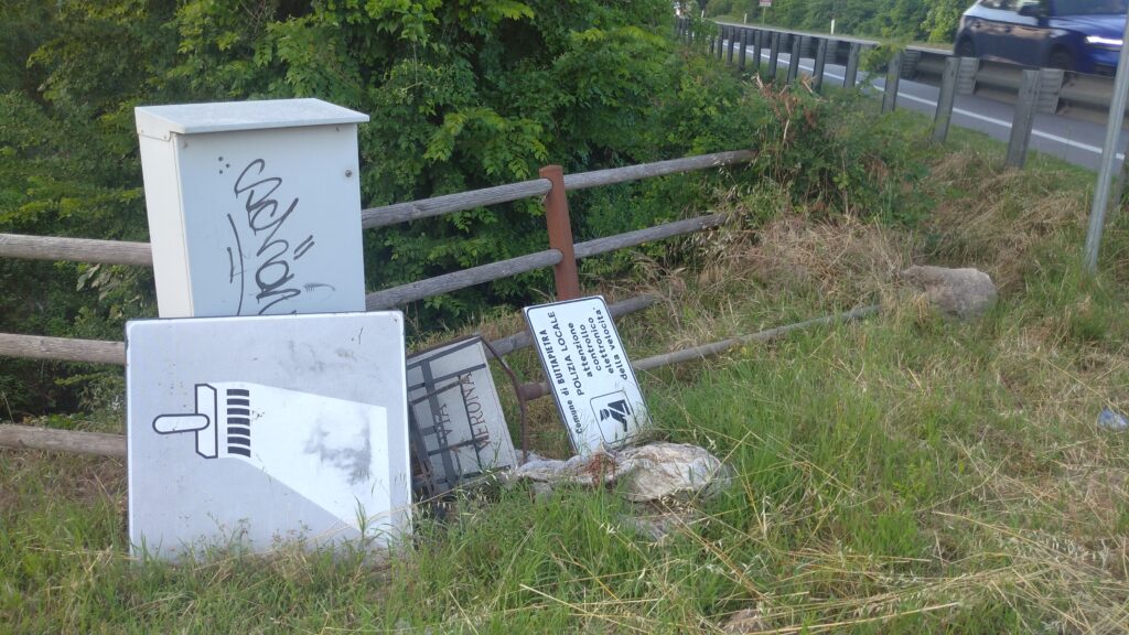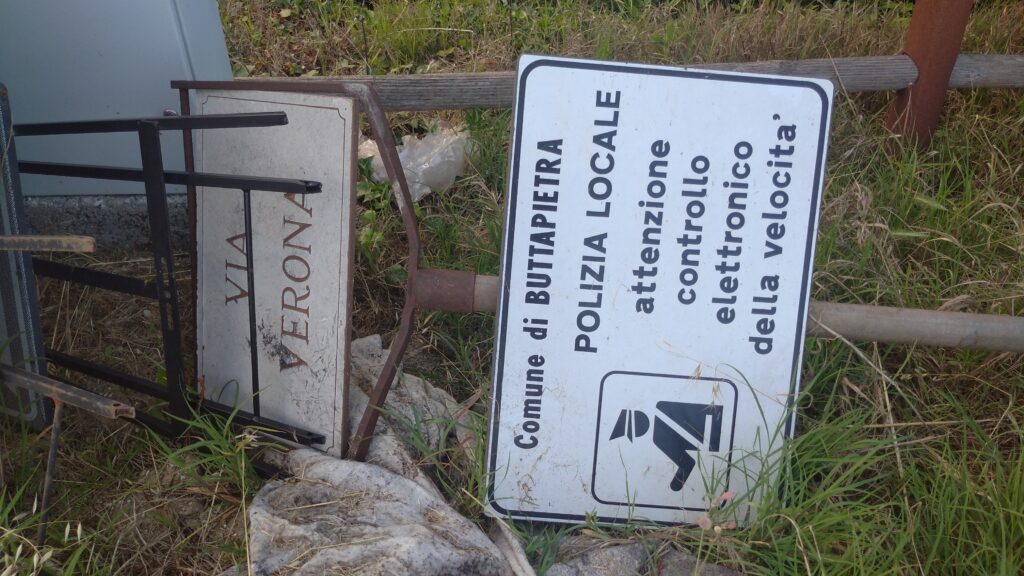 Buttapietra – Tabelle stradali (di “segni orizzontali in rifacimento”, di “attenzione controllo elettronico della velocità” da parte della polizia locale del comune) e perfino un’asta metallica con targa marmorea d’indicazione di via Verona sradicata da terra.