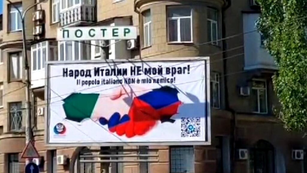 Il 19 giugno, a loro volta, sono apparsi a Donetsk (traslitterazione anglosassone di Doneck in russo, Donec’k in ucraino, nell’autoproclamata Repubblica Popolare di Donetsk annessa de facto alla Federazione Russa il 30 settembre 2022) altri cartelloni gemelli, nelle lingue russa ed italiana: “Il popolo italiano NON è mio nemico!”.