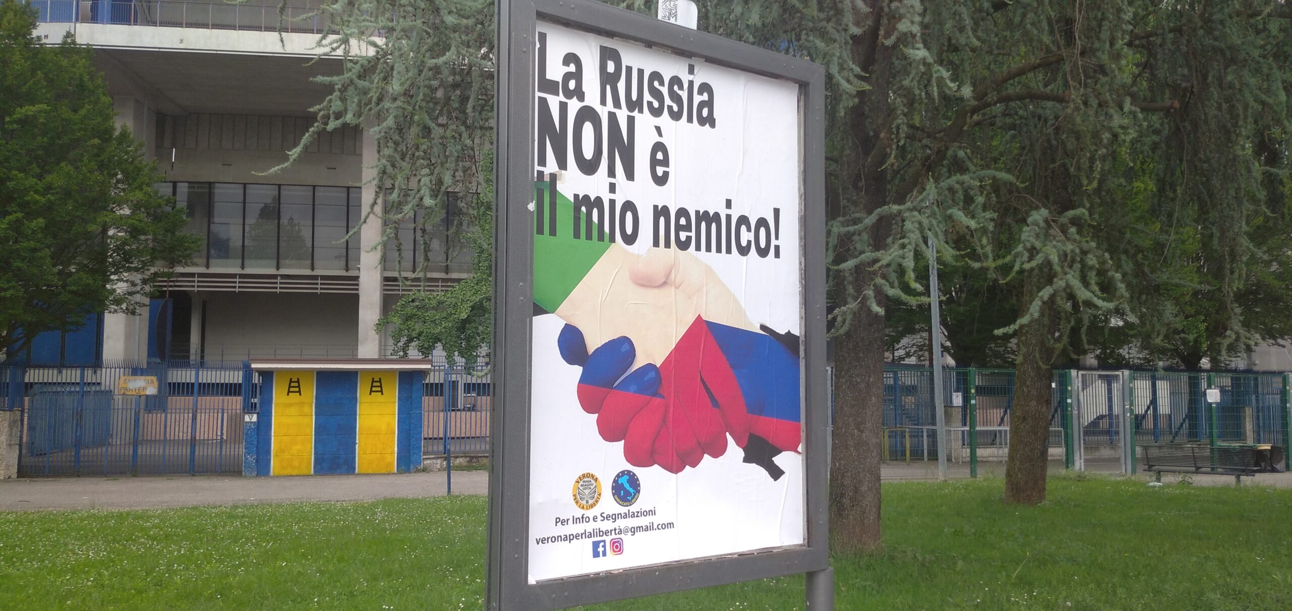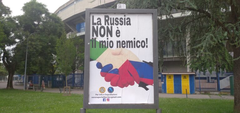 Continuano a scatenare polemiche (soprattutto da parte di ucraini appartenenti ad organismi socio-politici locali, tipo +Europa Verona che ha mosso accuse di “finto pacifismo”) gli oltre duecento manifesti fatti affiggere in giro per Verona e dintorni, dal 17 giugno scorso, dall’Associazione culturale Veneto Russia, da Verona per la Libertà e dal Sindacato Libero con la scritta a caratteri cubitali “La Russia NON è il mio nemico!”. E con, sotto, due mani che si stringono, una con i colori della bandiera italiana e l’altra con quelli del vessillo russo.