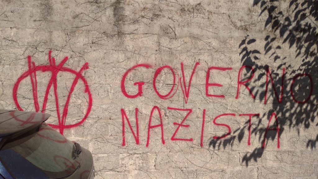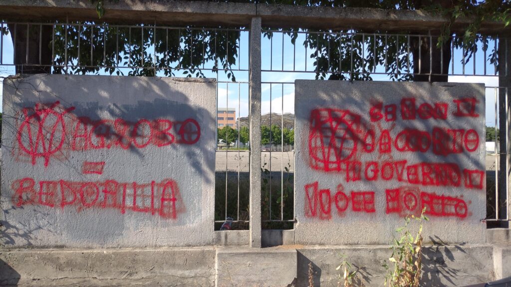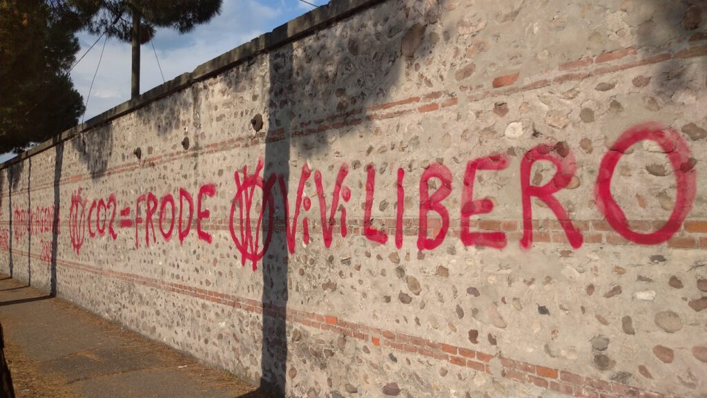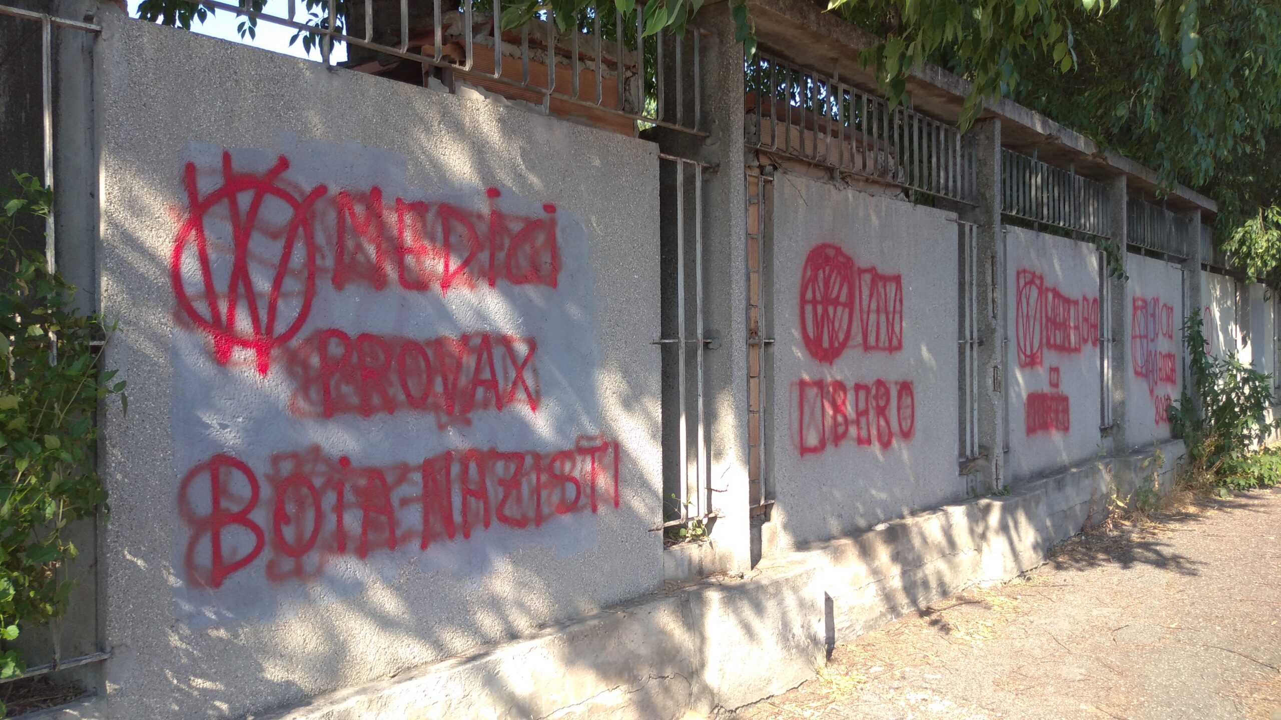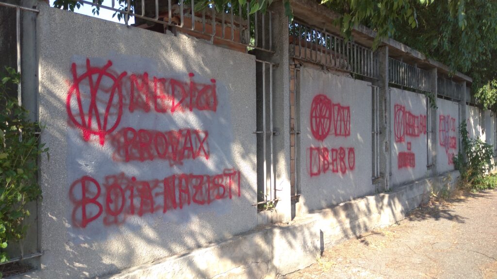 Aggiornamento delle gesta vandaliche no vax su muri cittadini. Gli attivisti anti obblighi vaccinali della controversa era Covid-19, a mano… armata di bomboletta spray rigorosamente di color rosso, hanno lasciato in altre vie smaccate tracce di contestazione in peregrinatio, dopo quelle già deturpate dalle loro scorrerie (ad esempio, all’esterno ed all’interno del parco di San Giacomo, in piazza Caterino Stefani, di fronte ad un ingresso laterale all’Adigeo, in via Niccolò Copernico).