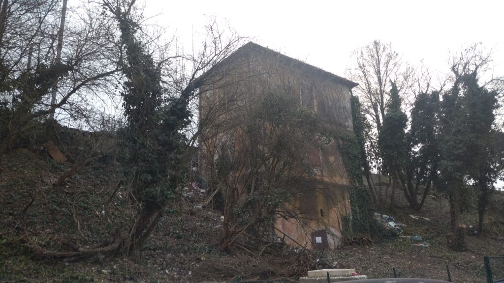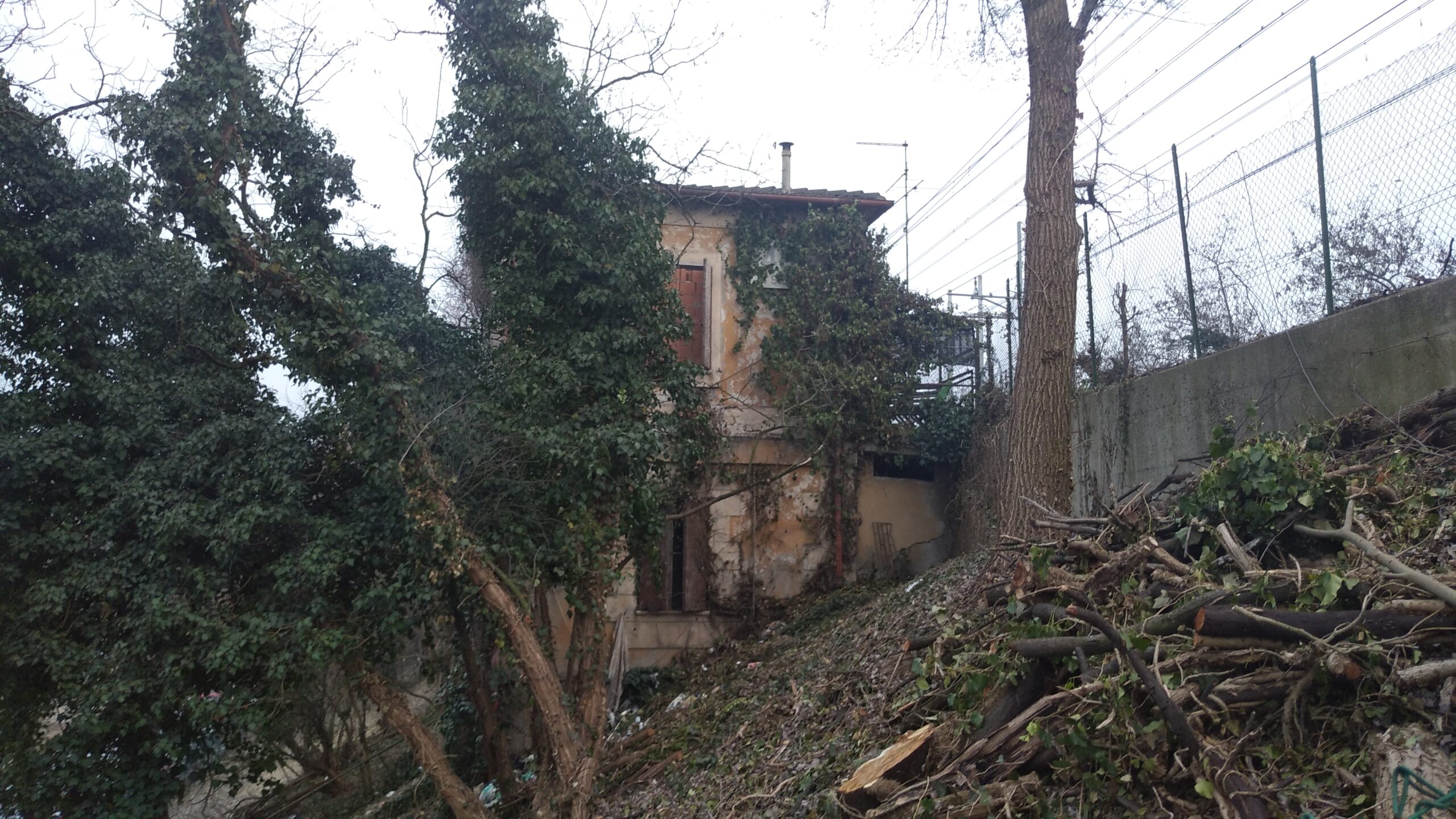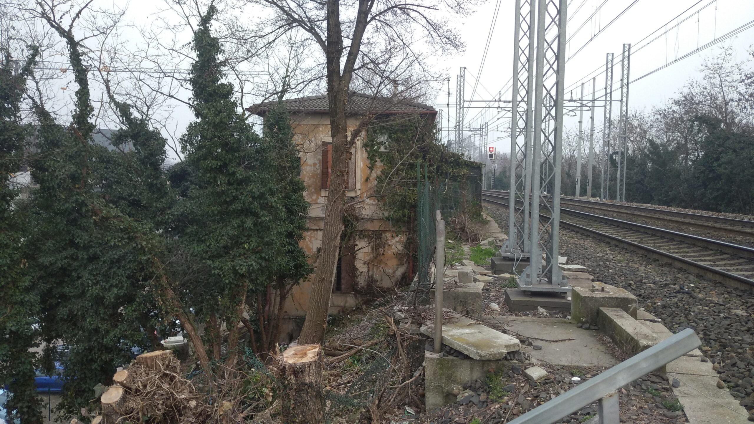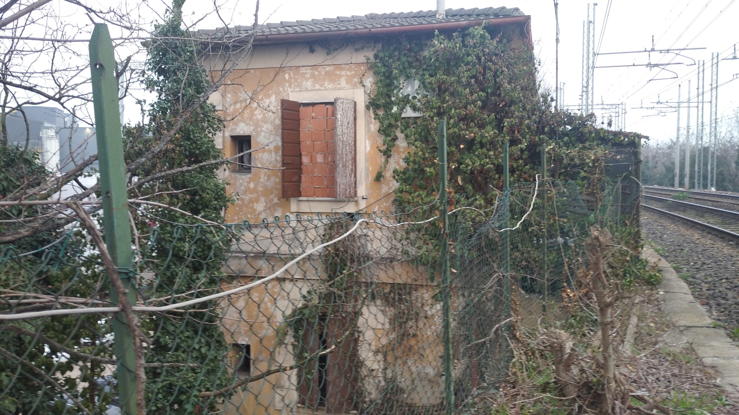Su tutto grava, dall’alto, un casello (o casa cantoniera) ferroviario, raggiungibile entrando da un cancelletto accostato (non chiuso con serratura o catena) e tramite una scalinata impervia e dissestata, con tanto di corrimano. Una seconda serie di gradini con infisso d’appoggio è presente all’altro lato dell’edificio ma in basso il relativo accesso risulta bloccato.